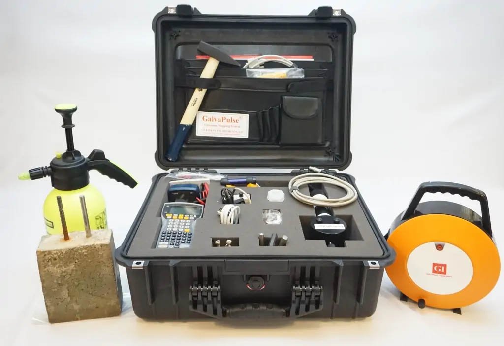 El GalvaPulse portátil y de mano evalúa la tasa de corrosión del refuerzo midiendo la resistencia a la polarización utilizando la técnica de pulso galvanostático, donde se impone un pulso de corriente en el refuerzo desde un electrodo de referencia de cloruro de plata (Ag/AgCl) colocado en la superficie del concreto. El refuerzo se polariza en la dirección anódica en comparación con su potencial de corrosión libre, Ecorr. El cambio resultante del potencial electroquímico del refuerzo se registra como una función del tiempo. La resistencia a la polarización del refuerzo se calcula mediante el ajuste de curvas de estos datos y, mediante la ecuación de Stern-Geary y la ley de Faraday, se estima la tasa de corrosión.